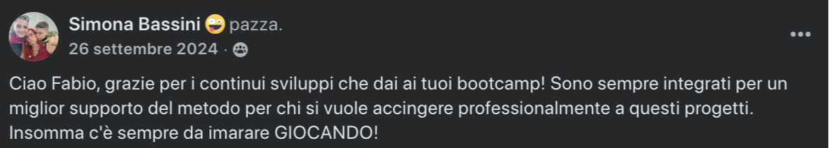 Il tutto ritrovando i tuoi compagni di classe del primo Bootcamp, quindi continuando questo percorso in un clima amichevole, collaborativo e riservato 😉