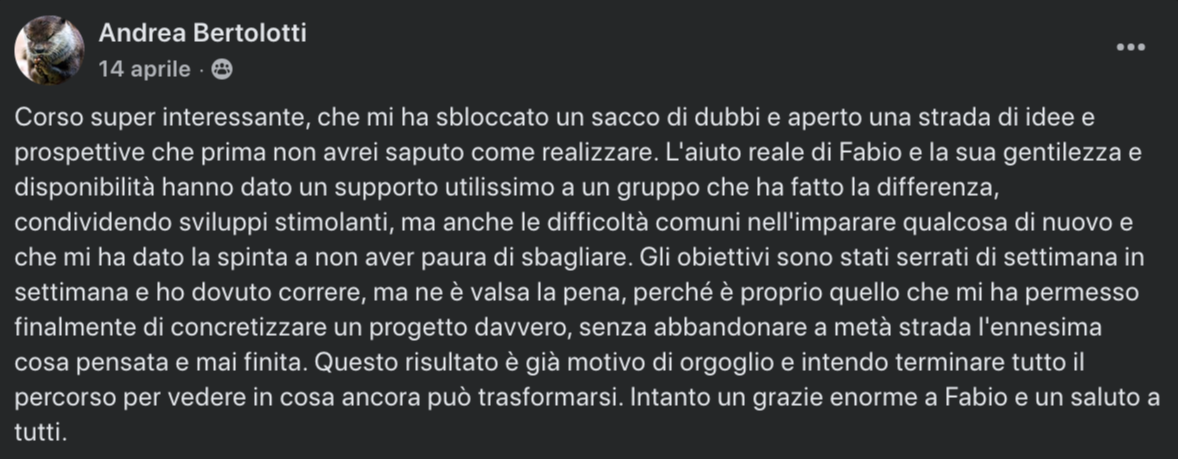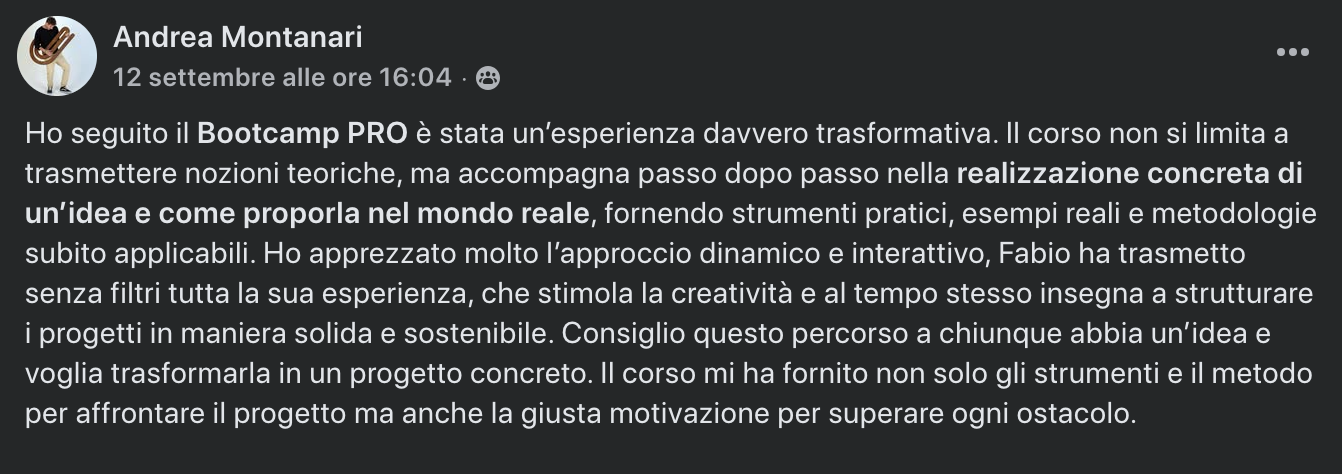 È l'ultima edizione di un programma frutto di 20 anni di formazione e attività sul campo, composto da training live, sessioni di consulenza su Zoom e il supporto costante di Fabio attraverso il gruppo Facebook privato.